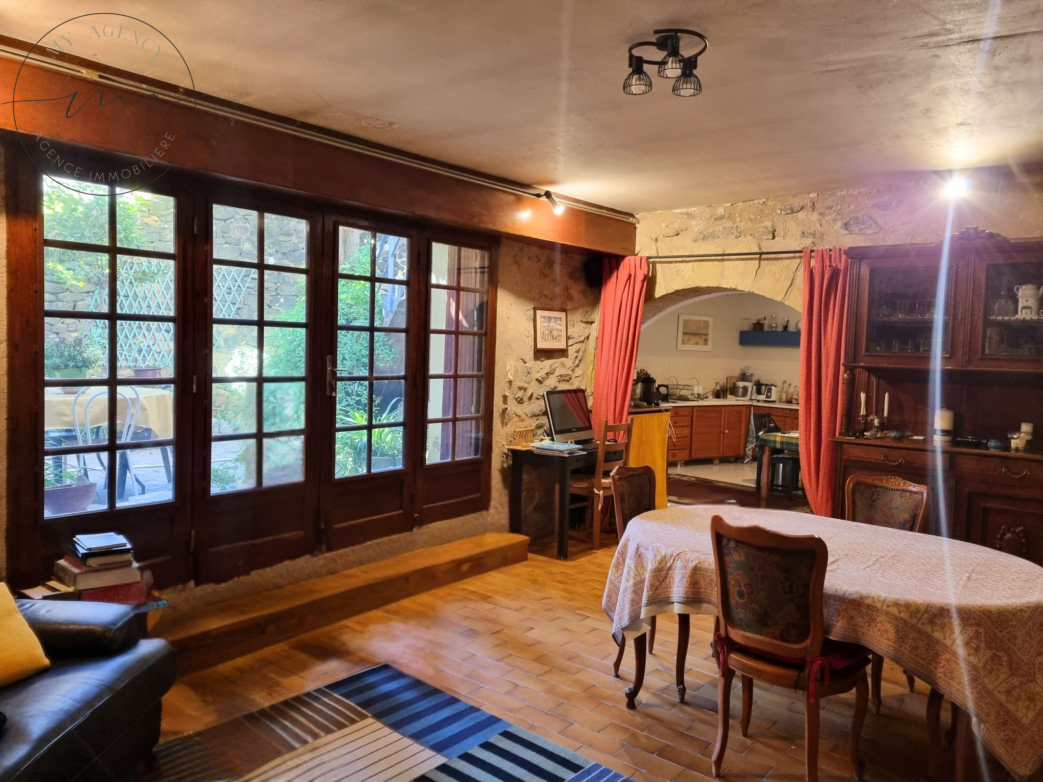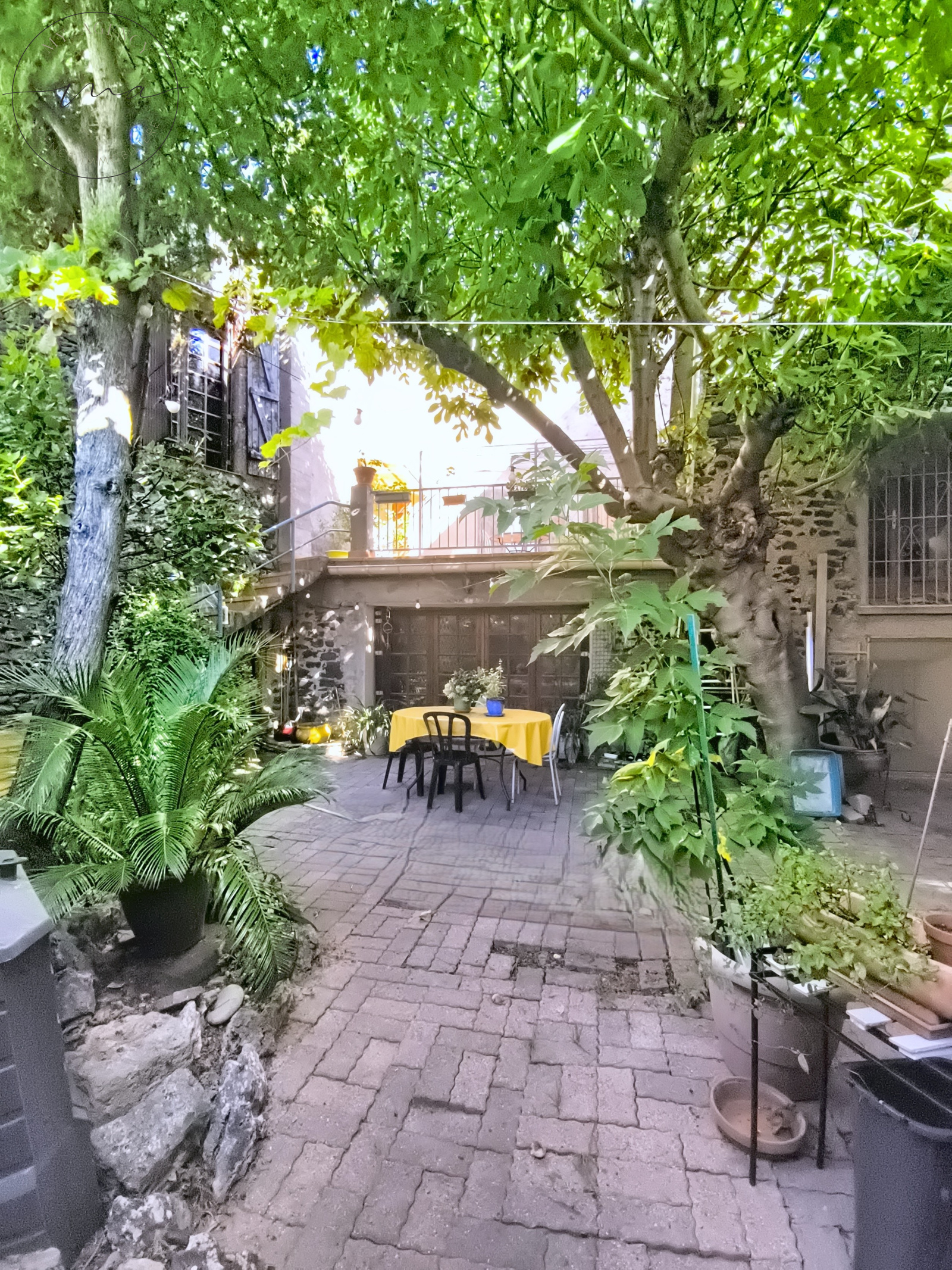 1er niveau : vaste cuisine ouverte, grand séjour/salon avec baie vitrée donnant sur la cour arborée au figuier centenaire, WC.