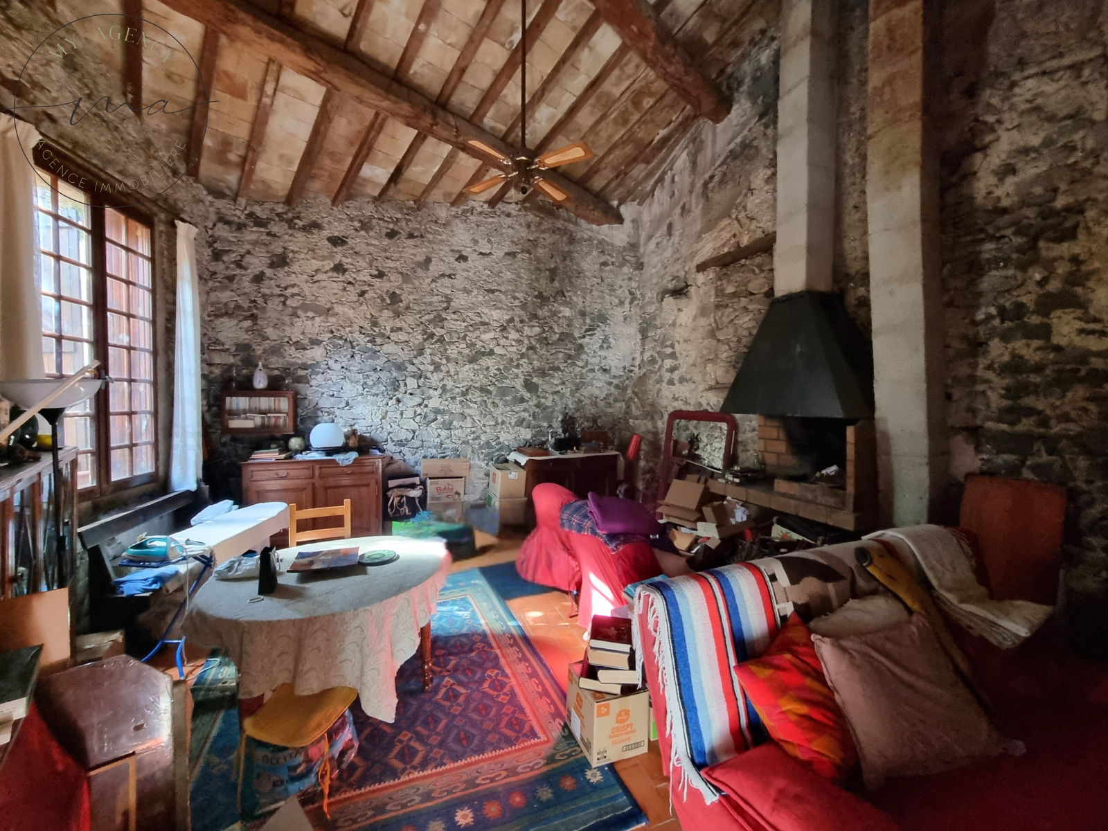 Demi-niveau : accès à une très grande terrasse et à une pièce avec cheminée et murs en pierre des anciens remparts, idéale pour créer une suite parentale.