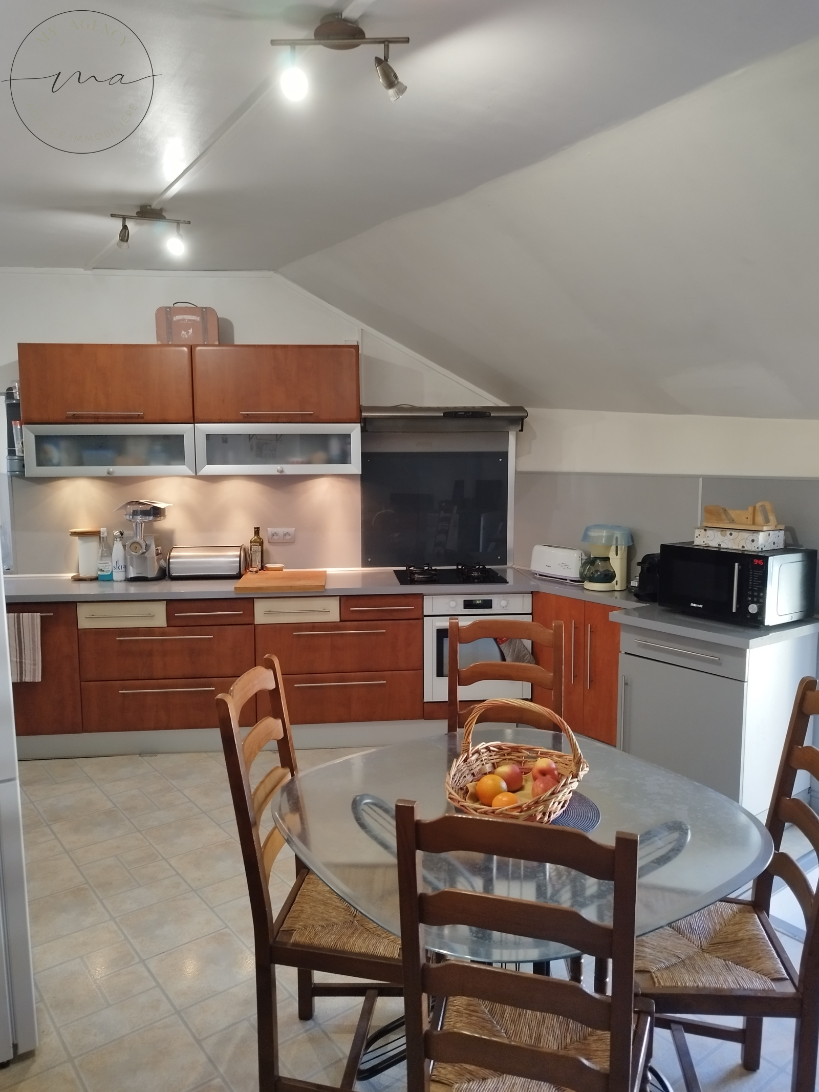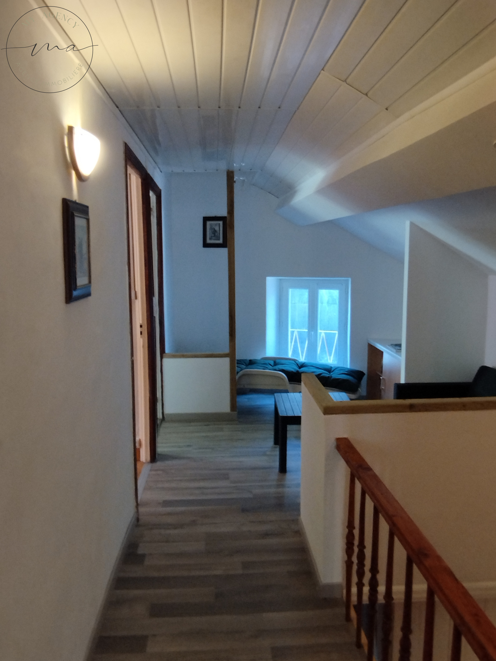 Elle se compose en RDC, d'une grande pièce de vie lumineuse avec une belle cheminée, une grande cuisine entièrement équipée de 21 m², un cellier, une chambre de 16 m², une salle d'eau ainsi qu'un wc indépendant.